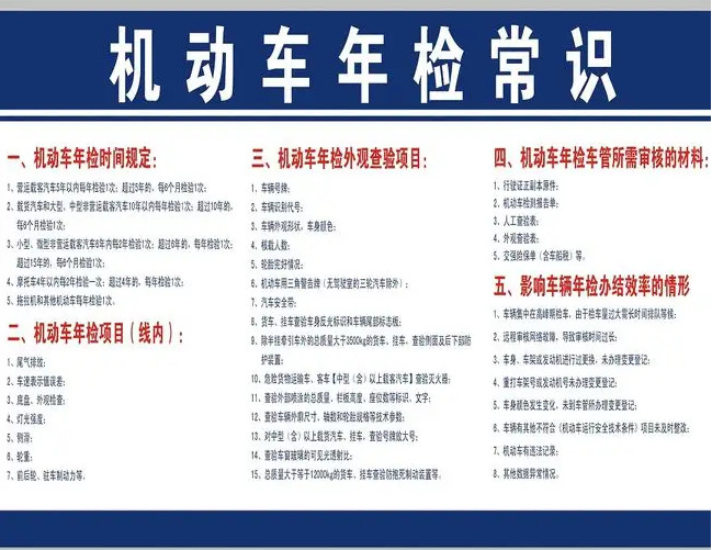 車輛年檢時間新規(guī)定: 1、非營運汽車(含非營運汽車、非營運小型客車和微型客車,自2020年11月20日起,7-9座非營運小型客車(廂式貨車除外)6年內(nèi)免檢上線,每兩年只需申領(lǐng)檢驗合格標(biāo)志;2020年11月20日起,檢驗周期6年以上不滿10年的,檢驗周期由每年一次放寬至每兩年一次,即私家車在10年內(nèi)只需網(wǎng)上檢驗兩次,分別為第6年和第8年。 車齡超過10年的私家車,仍執(zhí)行原檢驗周期,即10-15年,一年一次,15年以上,每半年一次。 2、營運客車5年內(nèi)年檢1次;滿5年的,每6個月一次; 3、貨車和大中型非營運客車10年內(nèi)每年檢驗一次,10年以上每6個月檢驗一次; 4、摩托車4年內(nèi)每2年檢驗一次;4年以上,一年一次。 《機動車登記條例》第四十九條明確規(guī)定: 機動車所有人可以在機動車檢驗期屆滿前三個月內(nèi)向注冊地車管所申請檢驗合格標(biāo)志。申請前,機動車所有人應(yīng)當(dāng)處理涉及該車輛的道路交通違法行為和交通事故。 年檢基本流程 1、填寫機動車牌證申請表和機動車查驗記錄表兩張表格; 2、找到年檢錄入窗口,審查材料,錄入; 3、找到違規(guī)查詢窗口,如有違規(guī),在此一并繳清罰款; 4、找檢測員進行車輛的外檢,要求打開車前蓋,查驗車架號,檢測員給出檢測合格簽字頁,之后,到檢測繳費窗口(一般是100元),給發(fā)票; 5、、找到檢測登錄窗口,所有材料留在該窗口處; 6、排隊等待檢測,檢測完后給一張檢測報告單; 7、上交年檢材料給工作人員; 8、年檢合格,頒發(fā)年檢標(biāo)志。